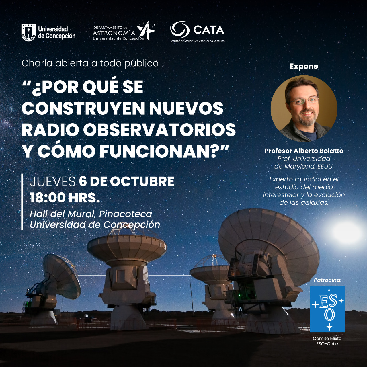 La invitación es a toda la comunidad a participar de la charla “¿Por qué se construyen nuevos radio observatorios y cómo funcionan?”, a las 18:00 horas del jueves 06 de octubre 2022, en el Hall del Mural en la Casas del Arte. Además la actividad se transmitirá en vivo por la fan page de Facebook y perfil de Instagram del Departamento de Astronomía UdeC.