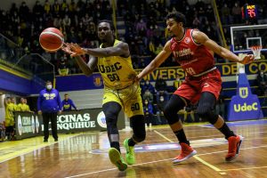 Tres jugadores, el entrenador y el jefe de Unidad de Deportes analizan la victoria del anfitrión, la Universidad de Concepción, sobre la Pontificia Universidad Católica de Valparaíso en la Casa del Deporte.