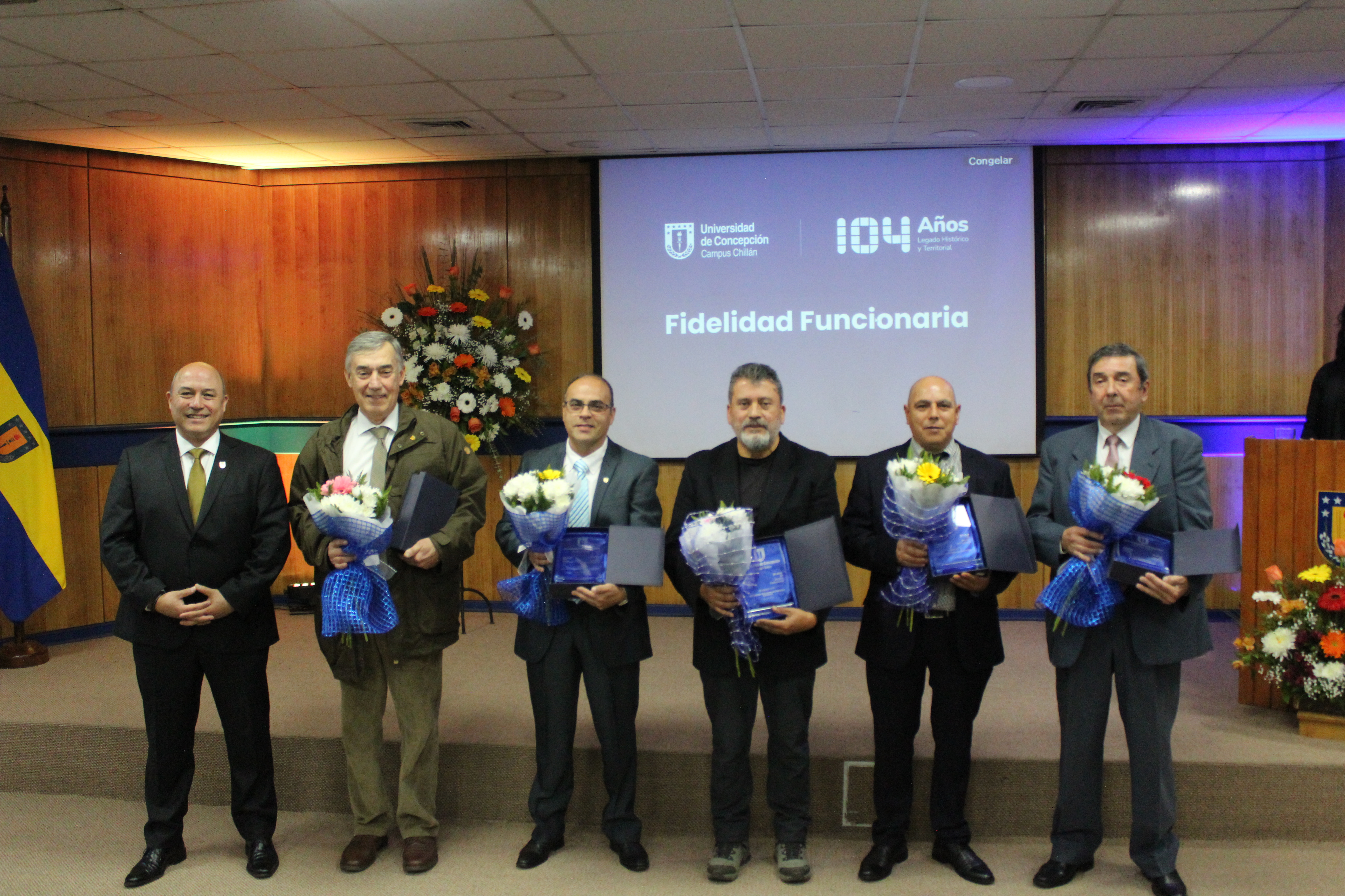 Por consiguiente, en esta ocasión se entrega por duodécima vez este reconocimiento y que corresponde por 35 años de servicio institucional a las y los siguientes trabajadores: Sergio Cortés Oyarce de Dirección General, Esteban Andrés Muñoz Villar, de la Facultad de Agronomía, Jerónimo del Carmen Paredes Cáceres, de la Facultad de Ingeniería Agrícola, Claudio Javier Rodríguez Quezada, de Dirección General y Óscar Enrique Skewes Ramm, de la Facultad de Ciencias Veterinarias, quienes recibieron del Director General del Campus Chillán un galvano con tal distinción.