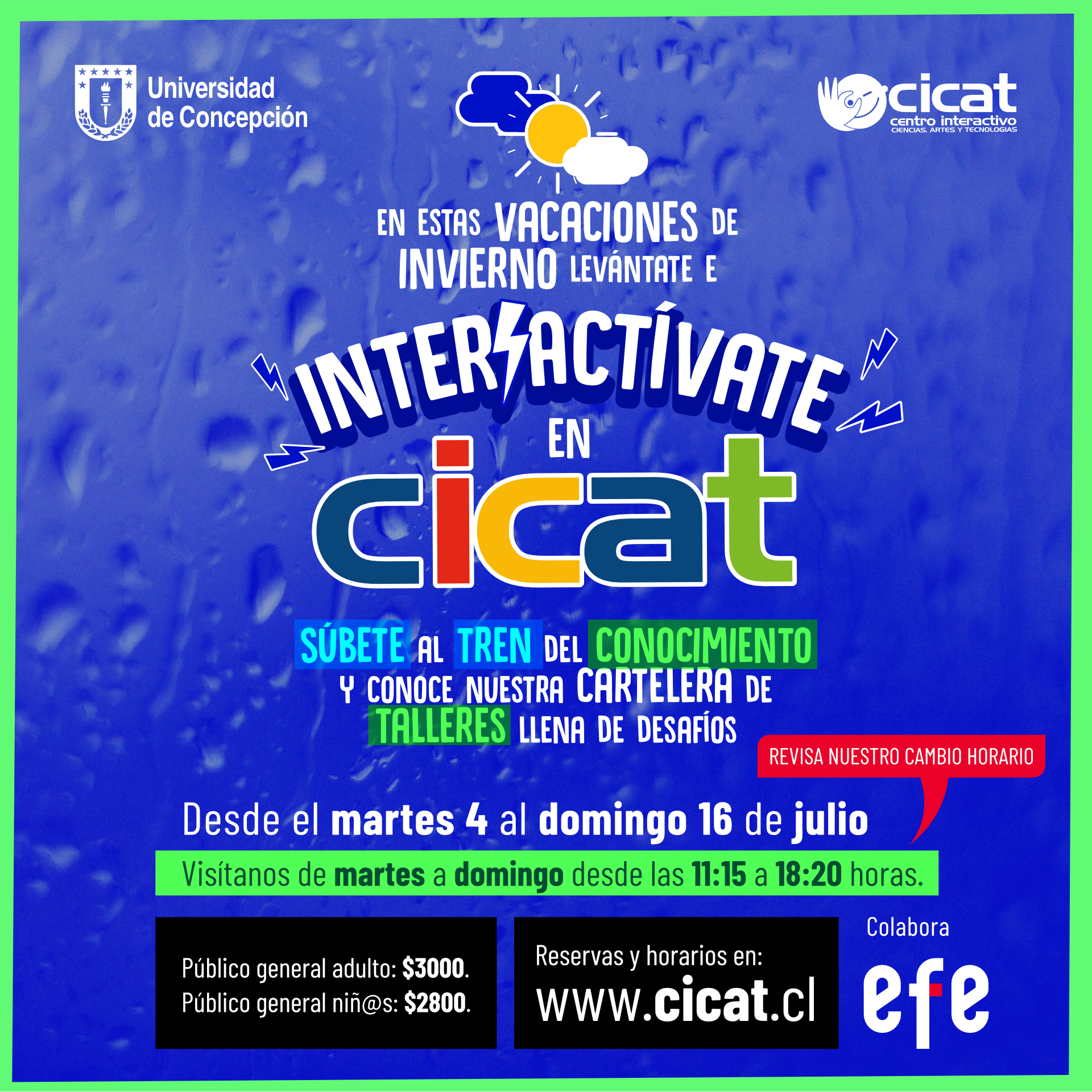 Desde el martes 4 hasta el domingo 16 de julio, CICAT de la Universidad de Concepción invita a todas las familias de la región a disfrutar de la nueva propuesta de talleres y un recorrido libre por sus salas; actividades que funcionarán de martes a domingo de 11:15 a 18:20 horas en Avenida Cordillera #3582, Coronel, a pasos de la estación de Biotren Los Canelos.