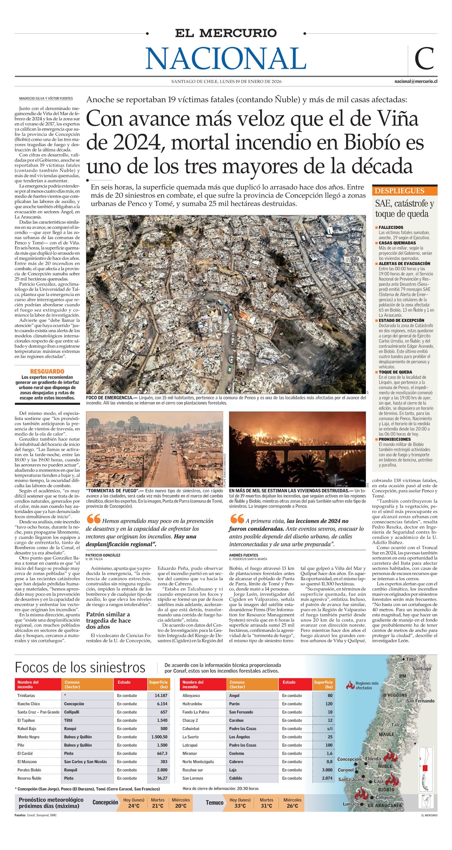 El megaincendio en la Provincia de Concepción, uno de los tres más graves de la década, arrasó 25 mil hectáreas en seis horas y alcanzó zonas urbanas de Penco y Tomé, dejando 19 muertos y más de mil viviendas destruidas. El Vicedecano de la Facultad de Ciencias Forestales UdeC, Dr. Eduardo Peña Fernández, observó su inicio cerca de Cabrero y alertó sobre la rápida formación de focos satélites que aceleraron la propagación.