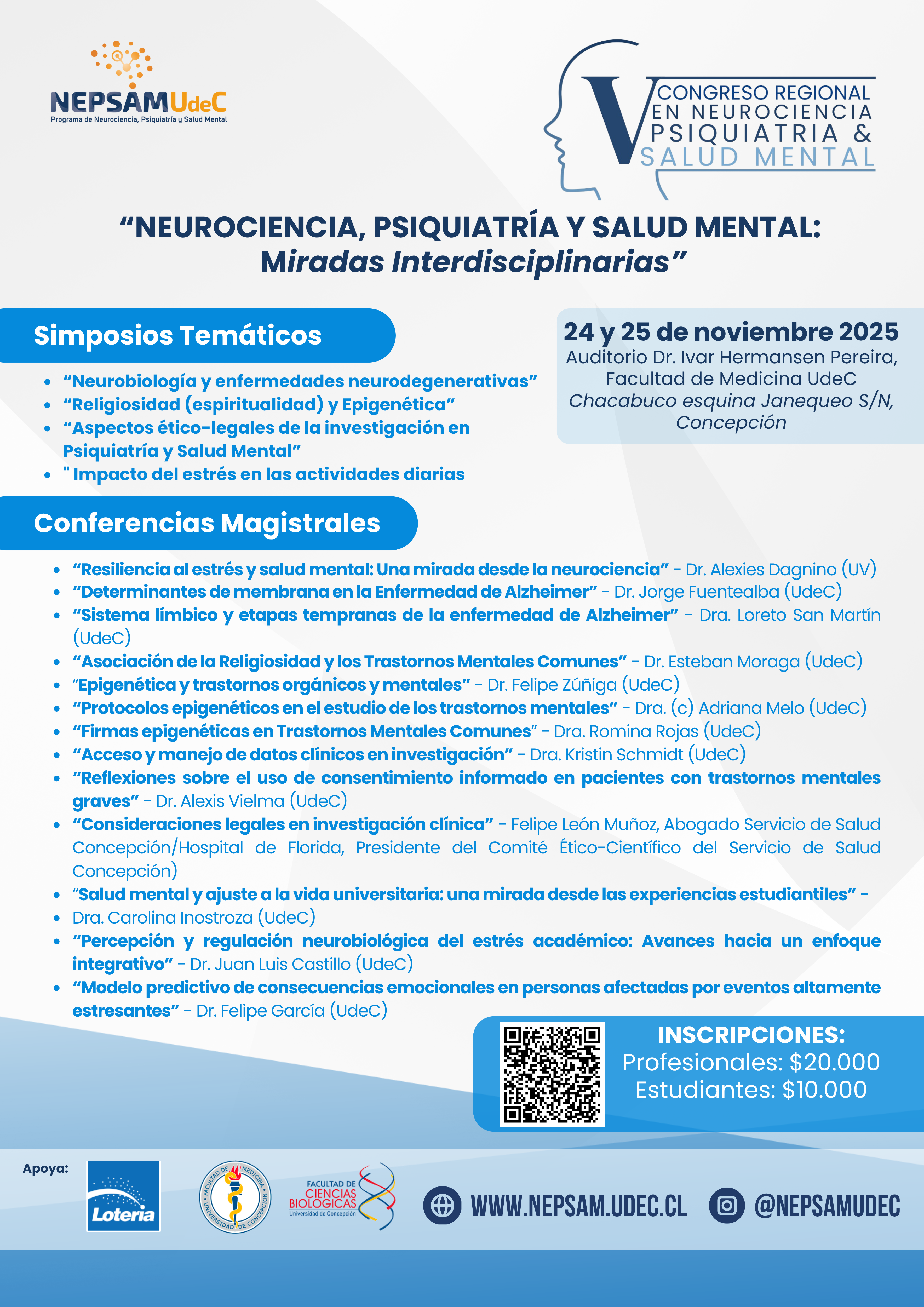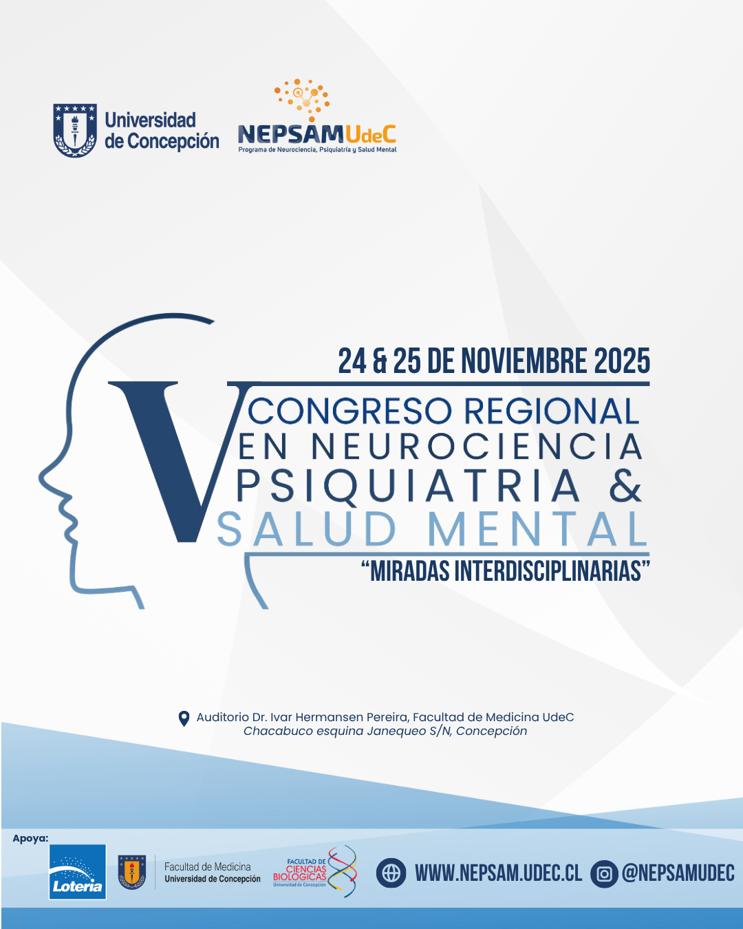 Con el propósito de fortalecer la investigación y el diálogo interdisciplinario en torno a la salud mental, el Programa de Neurociencia, Psiquiatría y Salud Mental (NEPSAM-UdeC) llevará a cabo el V Congreso Regional en Salud Mental, los días 24 y 25 de noviembre, en el Auditorio Dr. Ivar Hermansen Pereira de la Facultad de Medicina de la Universidad de Concepción.