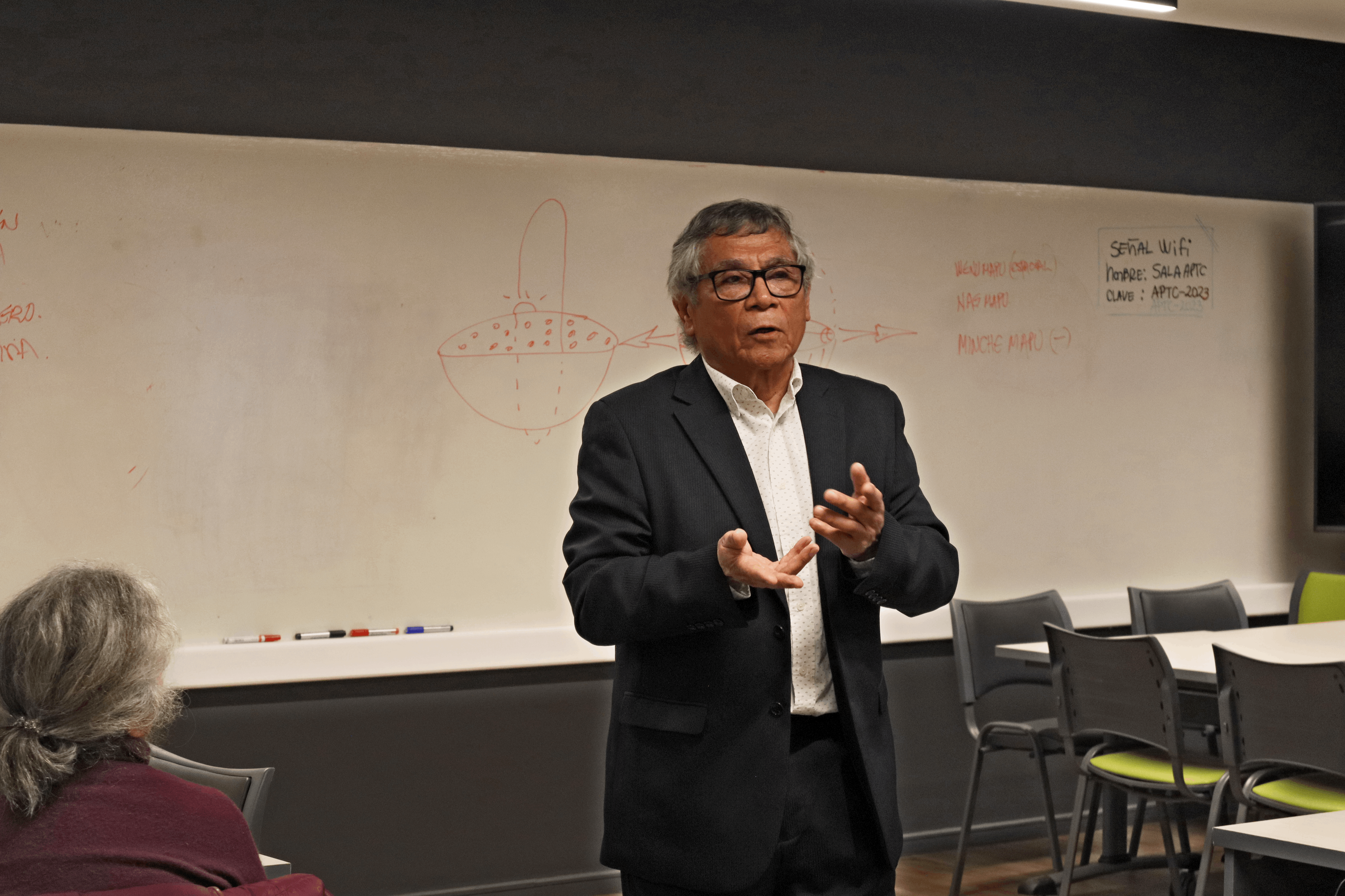 Mientras Juan Painecura adentraba a las y los asistentes en una serie de conceptos del pueblo mapuche, la sala APTC de la Biblioteca del Campus Los Ángeles de la Universidad de Concepción, mantenía un respetuoso silencio. El único quiebre de aquella atención para algunos fue la necesidad de apuntar en sus libretas ciertas ideas y explicaciones, con el fin de llevarse lo compartido por el rütrafe.