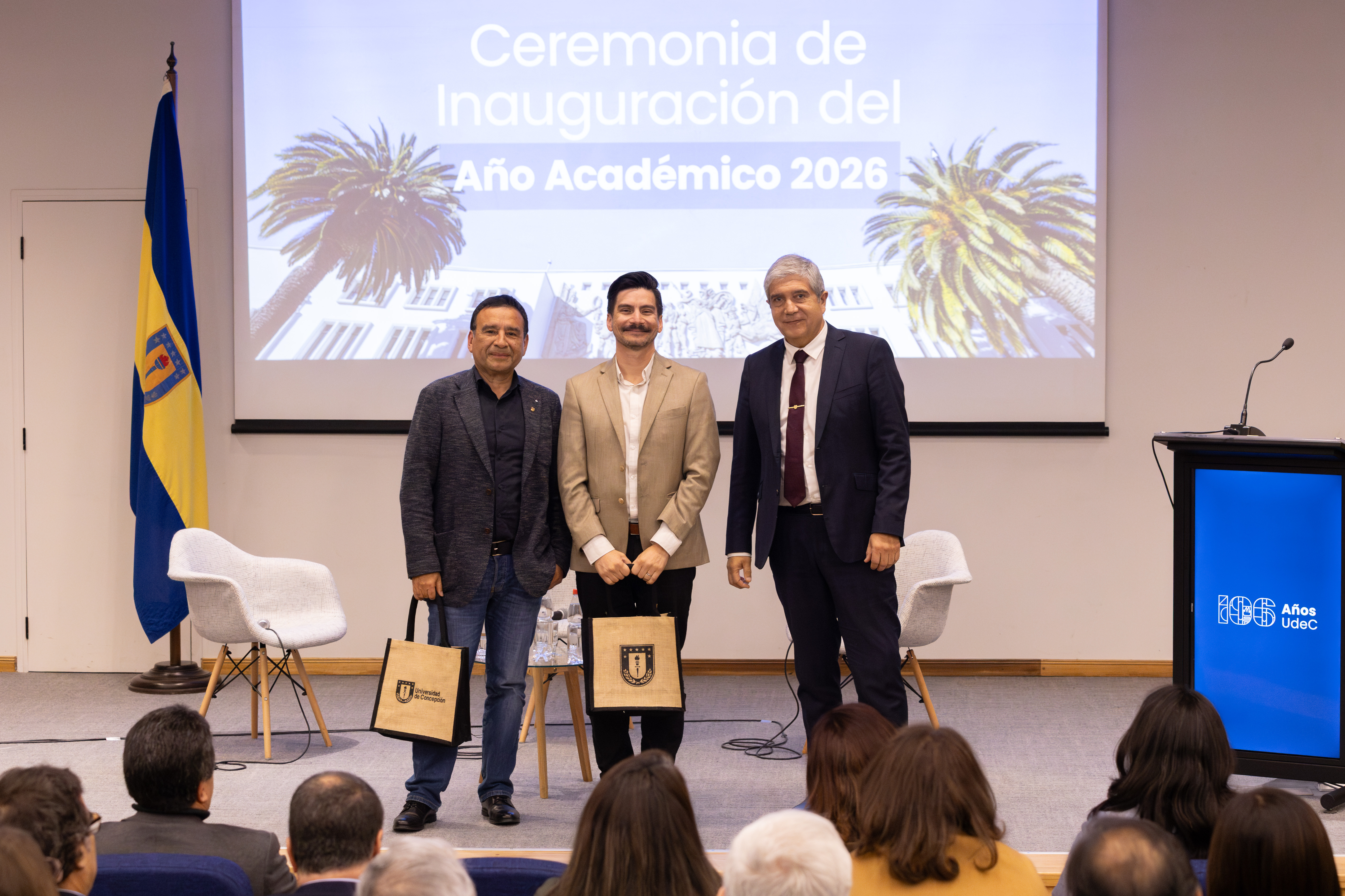 El Rector de la Universidad de Concepción expresó su satisfacción por haber podido inaugurar el año académico 2026 con dos personas que representan el espíritu de excelencia y de desarrollo de las fronteras del conocimiento a las que contribuye la UdeC en dos ámbitos complementarios.