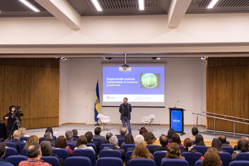 Luego de las palabras de bienvenida del Rector Saavedra inició la conferencia, siendo el Dr. Ulloa el primero en exponer. El también Director del Instituto Milenio de Oceanografía (IMO) presentó los resultados de la proeza tecnológica y científica que significó la Expedición Conjunta China-Chile (JCATE 2026) en la Fosa de Atacama.