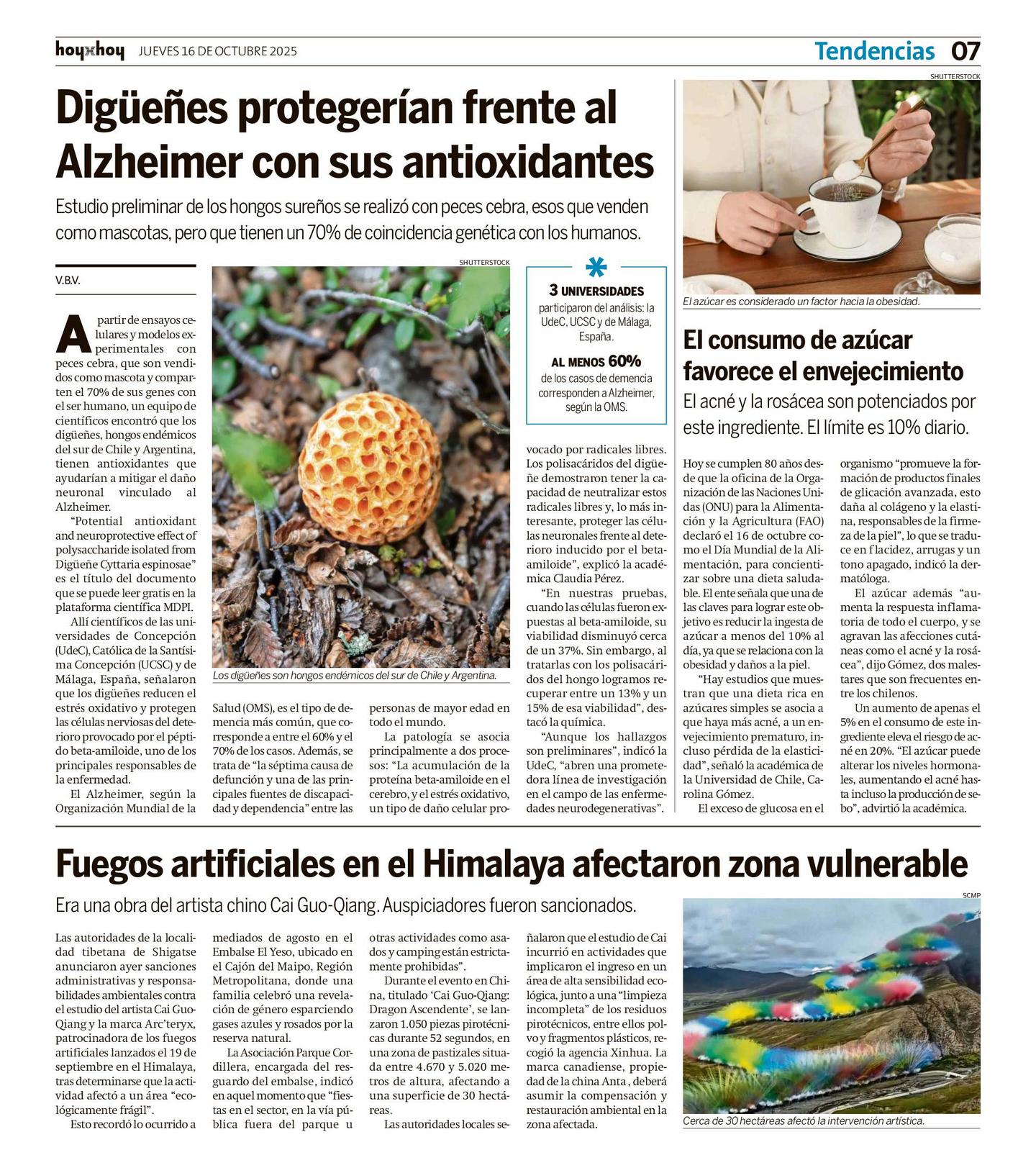 Un estudio preliminar con peces cebra, encabezado por investigadores de la UdeC y otras instituciones, reveló que los digüeñes poseen polisacáridos con efectos antioxidantes que podrían proteger frente al Alzheimer. El equipo científico halló que estos compuestos reducen el estrés oxidativo y el daño neuronal causado por beta-amiloide.