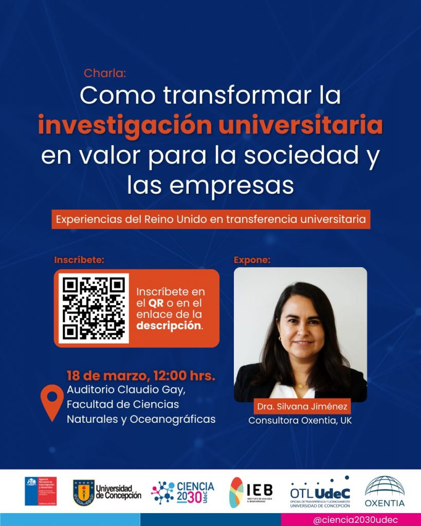 La charla “Cómo transformar la investigación universitaria en valor para la sociedad y las empresas: experiencias del Reino Unido en transferencia universitaria”, es organizada por el programa Ciencia 2030 UdeC, la Oficina de Transferencia y Licenciamiento (OTL) y el Instituto de Ecología y Biodiversidad (IEB) y dirigida a investigadores y estudiantes de postgrado, se posiciona como un espacio fundamental para fomentar la cultura de emprendimiento e innovación universitaria.