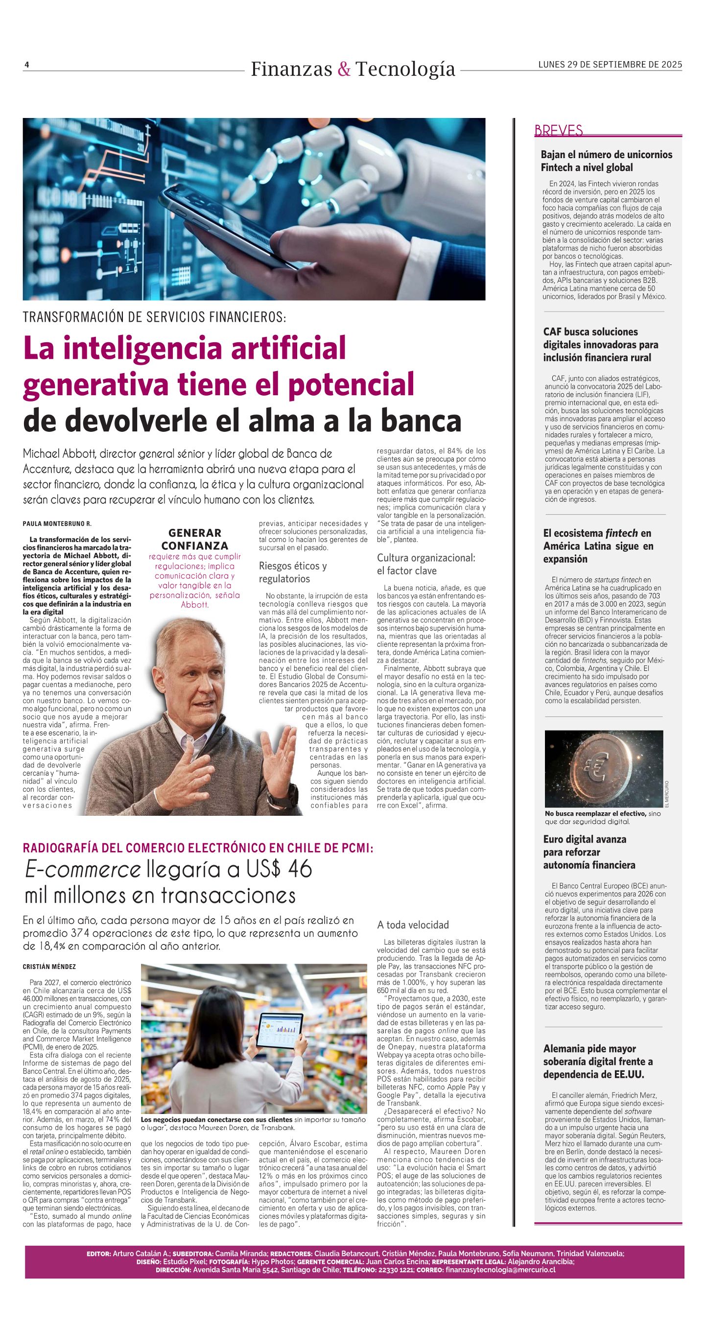 El e-commerce en Chile alcanzaría US$ 46 mil millones en 2027. El Decano de la Facultad de Ciencias Económicas y Administrativas UdeC, Álvaro Escobar González, proyecta un crecimiento anual del 12% o más, impulsado por la expansión de internet y el uso de apps de pago. Afirma que, aunque el efectivo no desaparecerá, su uso disminuye frente a nuevos medios digitales.