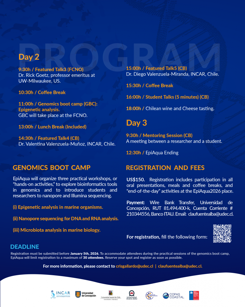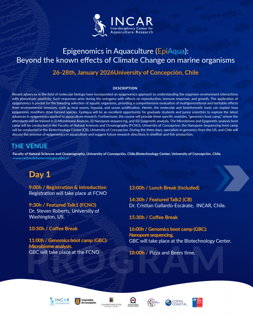 “En esta oportunidad, el Dr. Steven Roberts abordará cómo los mecanismos epigenéticos permiten la adaptación al medio ambiente, mientras que el profesor emérito Rick Goetz explorará la dimensión evolutiva de la adaptación a través de su modelo de trucha del lago. Desde INCAR, presentaremos investigaciones sobre ostras, choritos y peces vinculados a la acuicultura, ampliando el espectro de especies y enfoques”, adelantó el Dr. Gallardo Escárate.