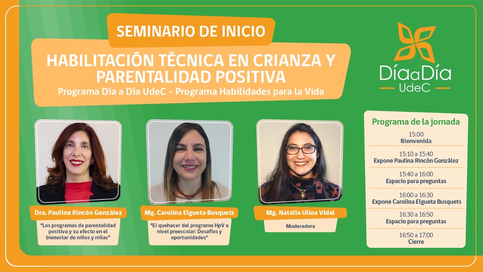 La habilitación técnica iniciará con un seminario el día viernes 11 de agosto, y será liderado por la Dra. Paulina Paz Rincón González, Directora del Programa Día a Día UdeC, y Vicerrectora de la Universidad de Concepción; y por la Mg. Carolina Elgueta Busquets, profesional del Programa y ex Coordinadora Regional del Programa Habilidades para la Vida en Ñuble.