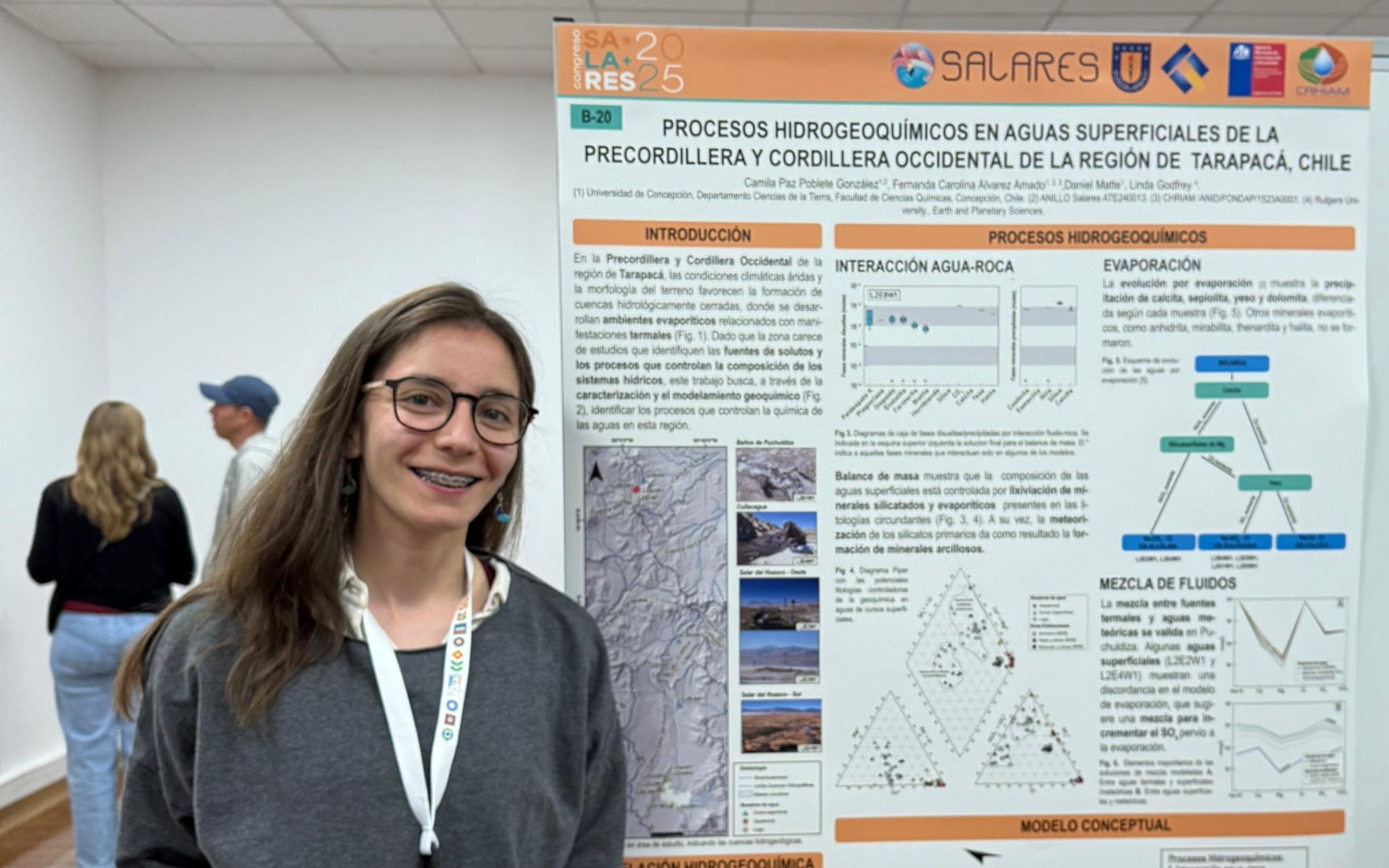 “El póster abordó la modelación de procesos hidroquímicos en cuencas de alta montaña de la Región de Tarapacá, evaluando mecanismos como la evaporación, la interacción agua–roca y la mezcla de aguas mediante el uso del software PHREEQC”, detalló la doctorante.