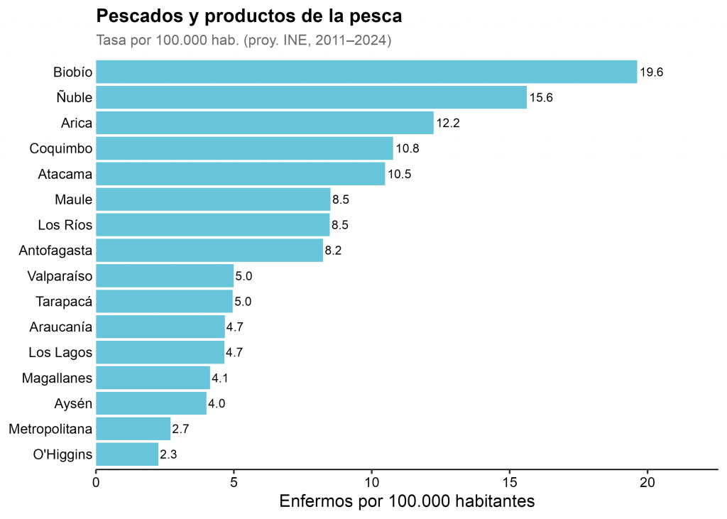 “Esta realidad se observa claramente al estandarizar el número de casos de ETAs por cada 100 mil habitantes para los alimentos que provienen de pescados y productos de la pesca. Las regiones de Biobío y Ñuble ocupan los primeros dos lugares con tasas promedio de 19,6 y 15,6 respectivamente, para el periodo comprendido entre los años 2011-2024”, comentó Victoria Herrera.