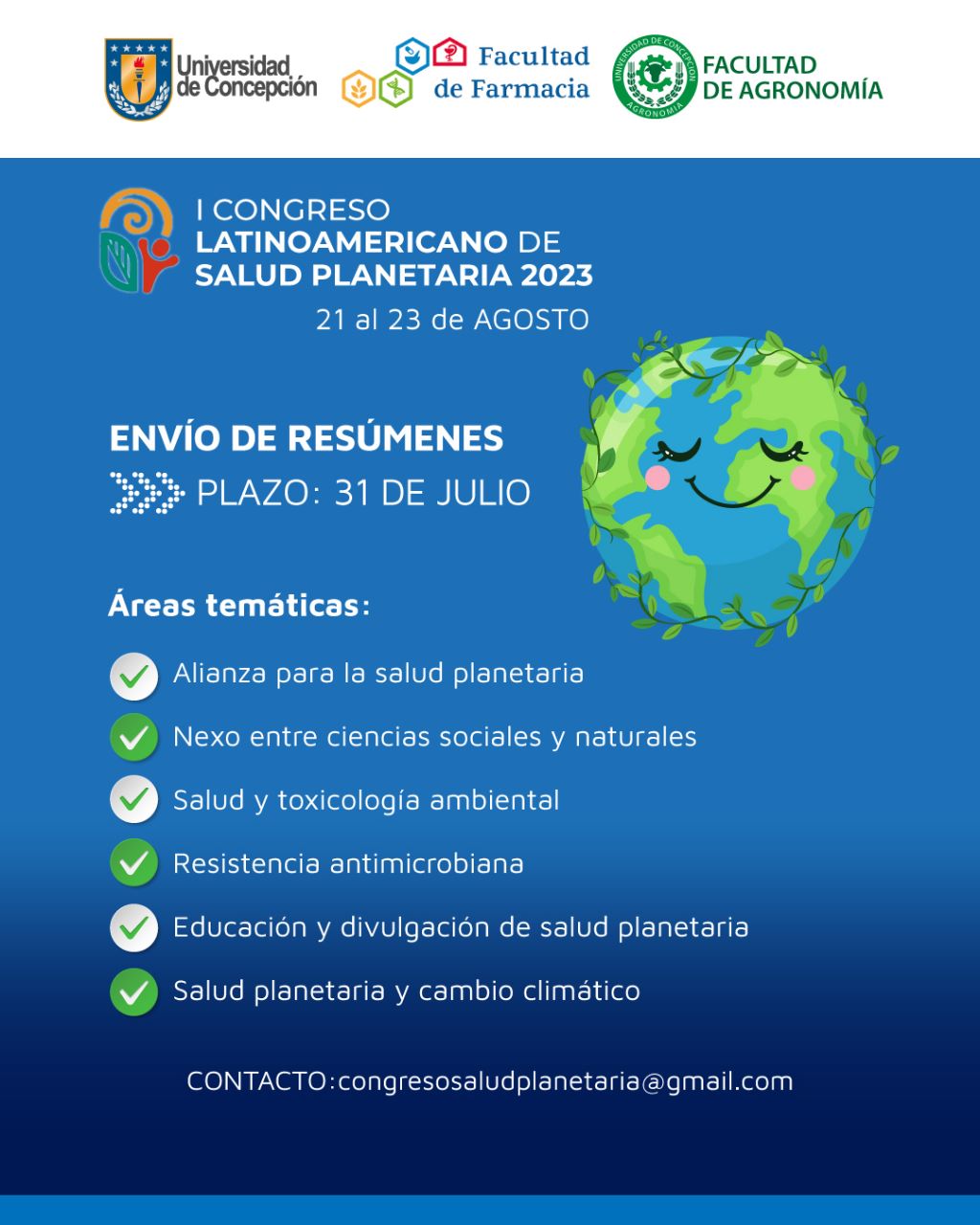 La Facultad de Farmacia y la Facultad de Agronomía desarrollarán en conjunto el 1° Congreso Latinoamericano de Salud Planetaria 2023, instancia que se llevará a cabo en modalidad híbrida del 21 al 23 de agosto de 2023, organizada por los académicos Dr. Winfred Espejo, del Departamento de Suelos y Recursos Naturales de la Facultad de Agronomía, y los académicos Dr. Claudio Müller y Dra. Berta Schulz, del Departamento de Farmacia de la Facultad de Farmacia.