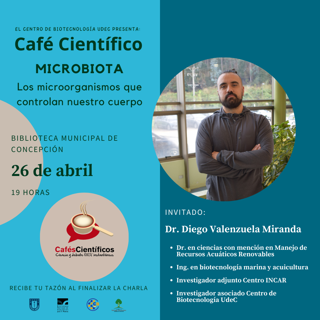 Este miércoles 26 de abril regresan los Café Científicos organizados por el Centro de Biotecnología de la Universidad de Concepción. En este nuevo ciclo, el Investigador Adjunto de la línea «Genómica Acuícola», del Centro Interdisciplinario para la Investigación Acuícola (INCAR), Dr. Diego Valenzuela Miranda, abrirá la edición 2023 de los conversatorios con la presentación «Microbiota: Los microorganismos que controlan nuestro cuerpo».