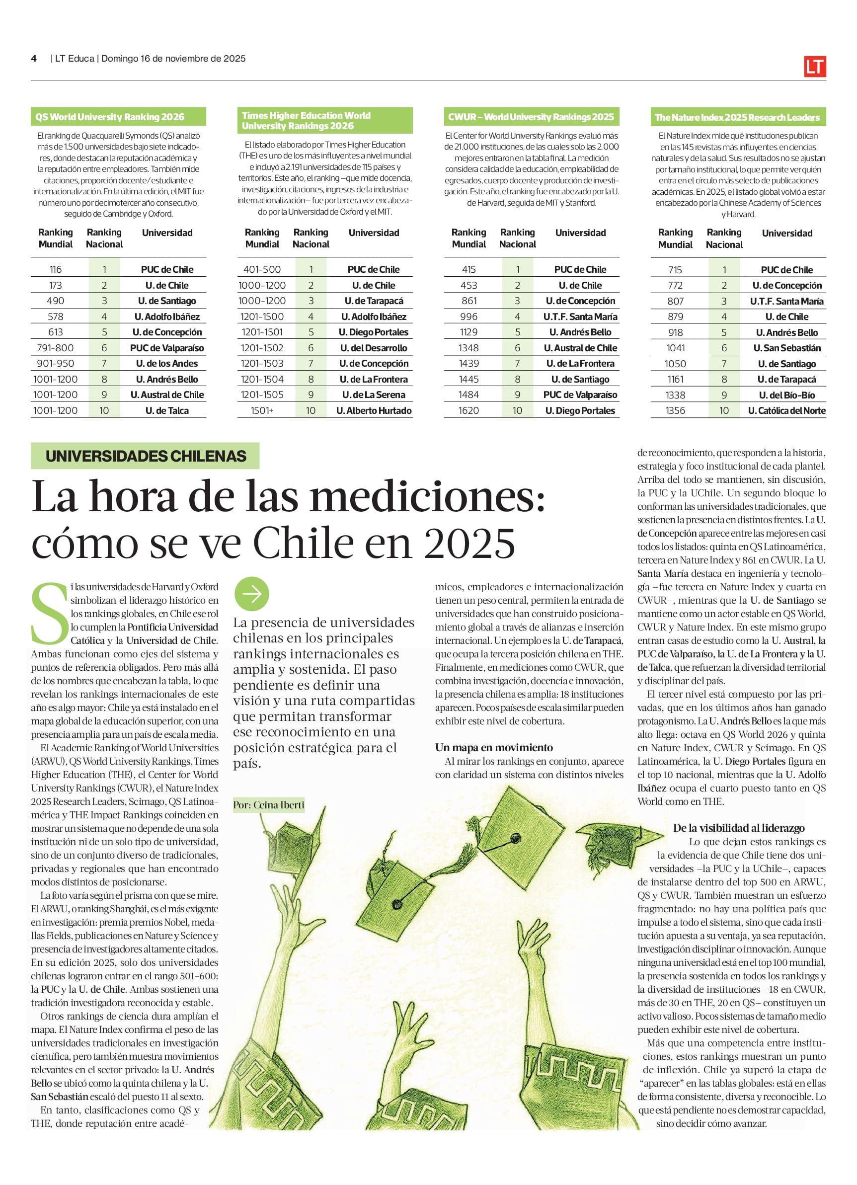 En 2025, Chile consolida su presencia en rankings globales de educación superior, destacando su diversidad institucional. La Universidad de Concepción figura entre las mejores del país: quinta en QS Latinoamérica, tercera en Nature Index y 861 en CWUR.
