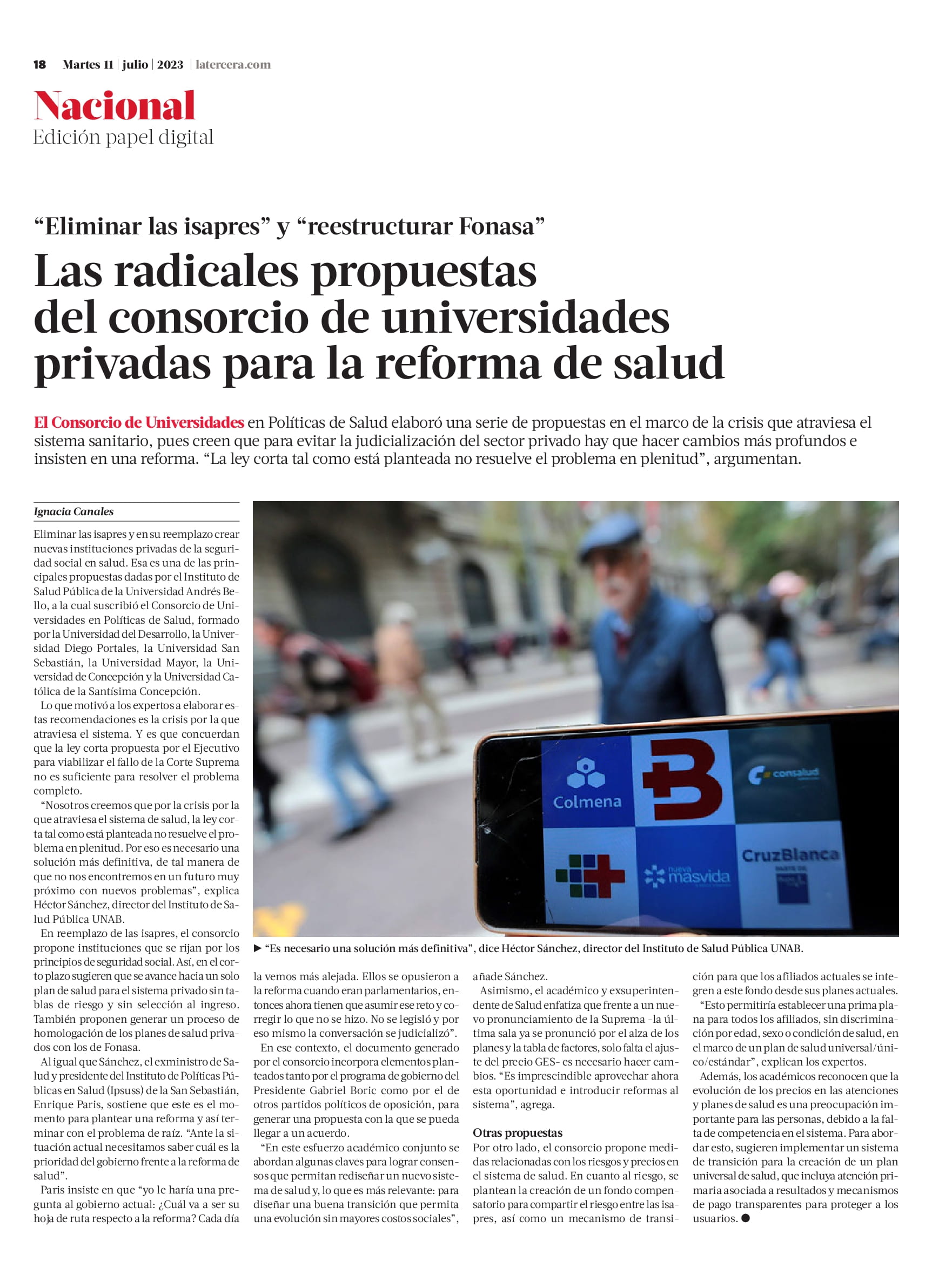 El Consorcio de Universidades en Políticas de Salud, entre las que se encuentra la Universidad de Concepción, propone eliminar las isapres y crear nuevas instituciones privadas de seguridad social en salud. Recomiendan un solo plan de salud sin selección al ingreso y homologación de planes privados con Fonasa. También plantean fondo compensatorio y mecanismos de transición para compartir riesgos y precios. Además, buscan consensos para una reforma integral del sistema de salud.