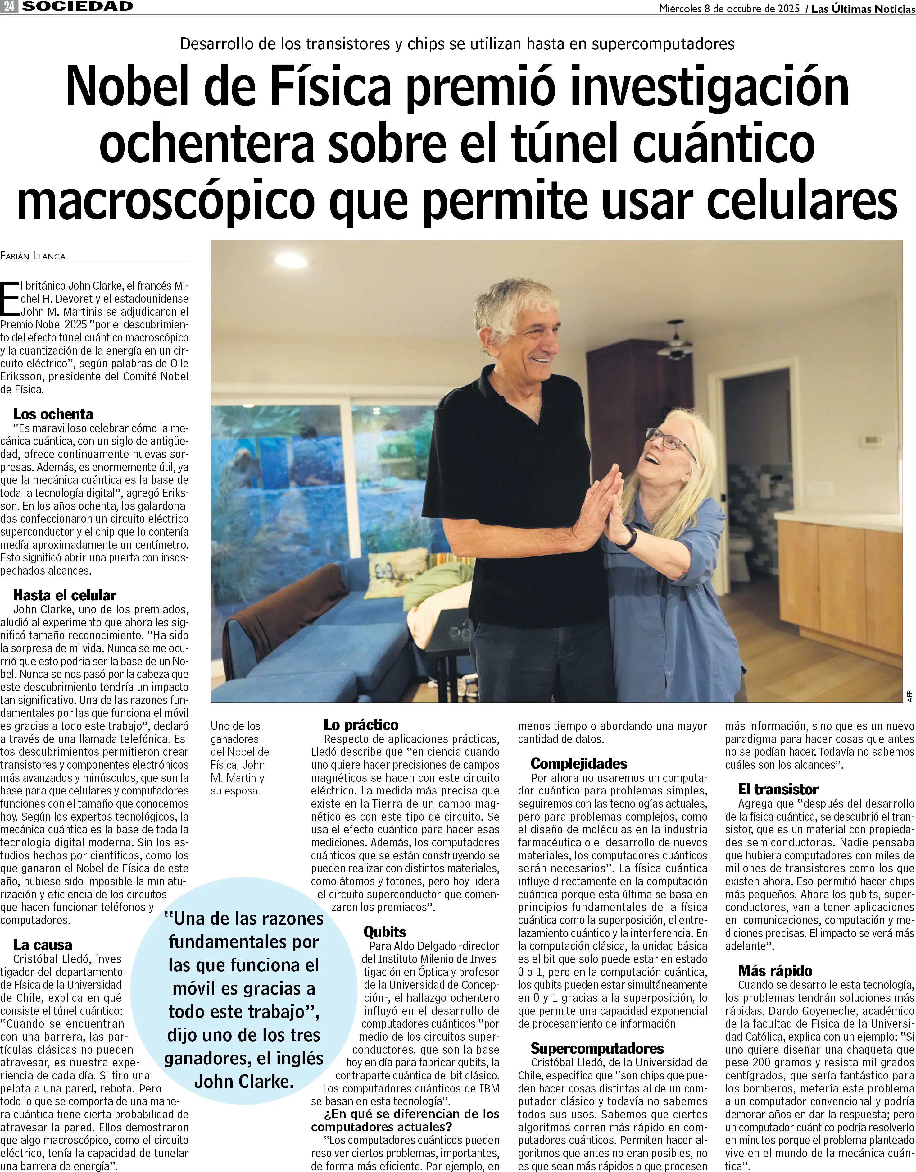 El Nobel de Física 2025 premió el hallazgo del túnel cuántico macroscópico, clave para celulares y supercomputadores. El Director del Instituto Milenio de Investigación en Óptica y académico de la Facultad de Ciencias Físicas y Matmáticas UdeC, Dr. Aldo Delgado Hidalgo, destacó que este avance permitió crear qubits mediante circuitos superconductores, base de la computación cuántica actual, como la usada por IBM.