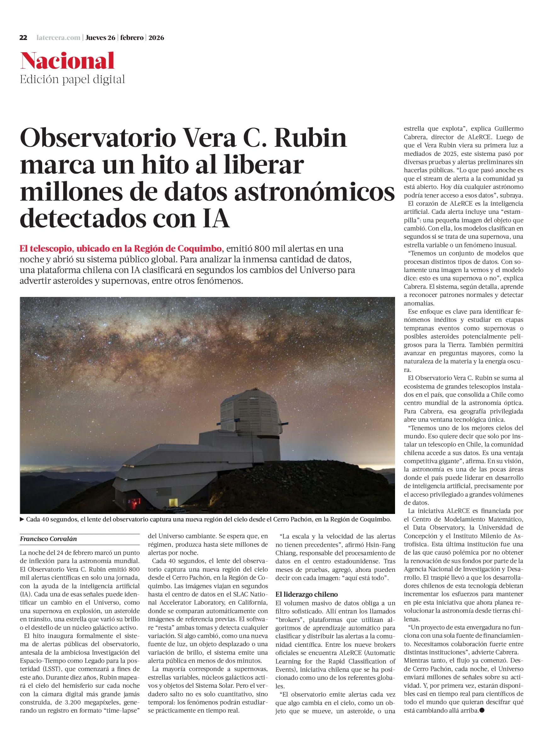 El Observatorio Vera Rubin abrió su sistema global con 800 mil alertas en una noche. El broker chileno ALeRCE, clave para clasificar datos con IA, permitirá identificar supernovas y asteroides en segundos. El académico UdeC y Director, de ALeRCE, Dr. Guillermo Cabrera Vives, destacó que cualquier astrónomo ya puede acceder a estas alertas y que Chile tiene una ventaja única por sus cielos y acceso a grandes volúmenes de datos.