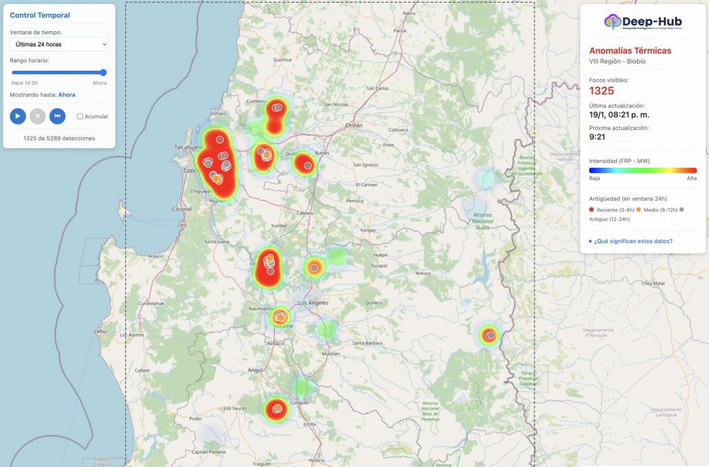 Profesionales de Deep-Hub Technologies, empresa nacida bajo el alero del Centro de Datos e Inteligencia Artificial (CDIA) de la Facultad de Ingeniería de la Universidad de Concepción, en conjunto con Imagine IT, desarrollaron una plataforma que permite monitorear en tiempo real los puntos de calor en la zona que actualmente se encuentra afectada por los incendios en el país.