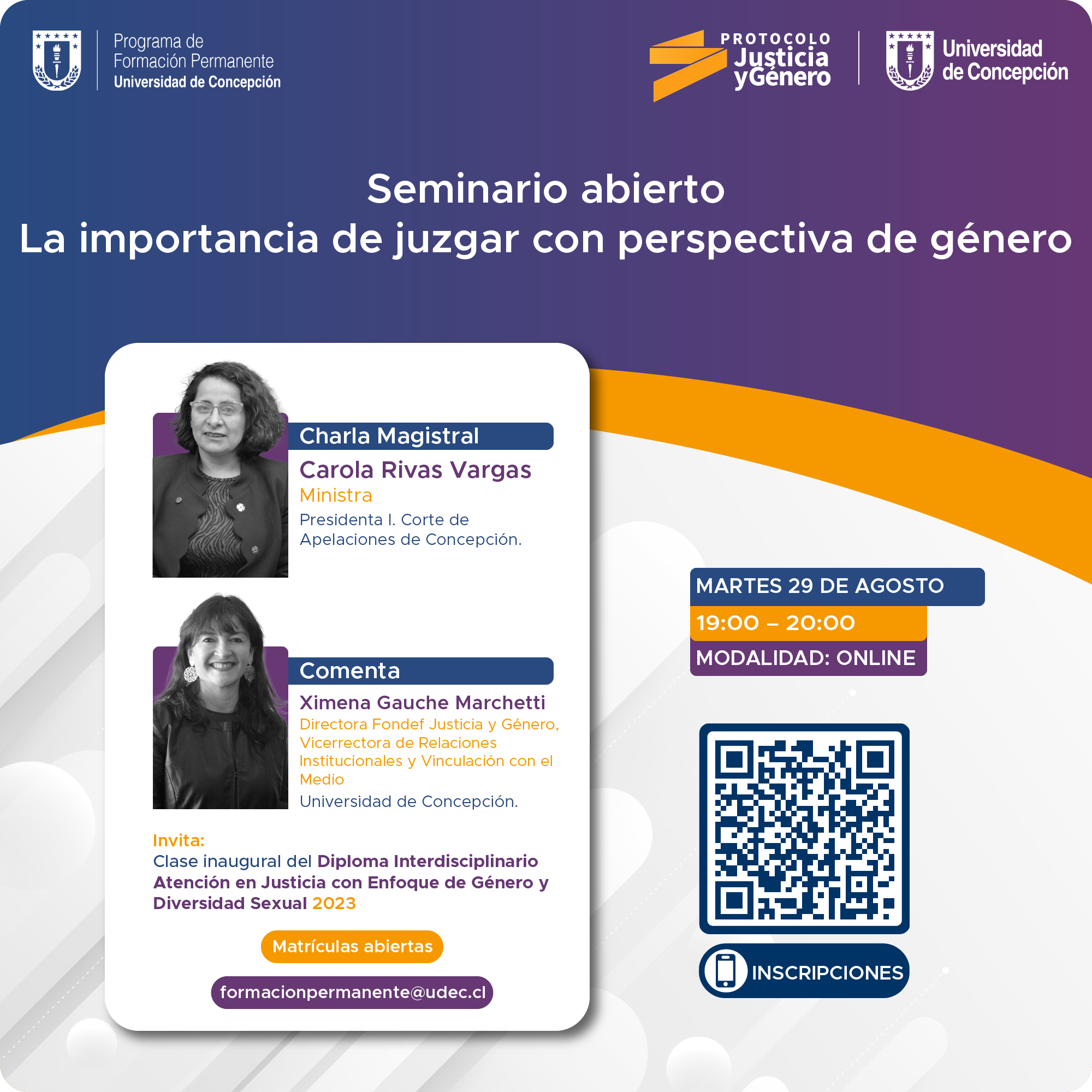 La charla magistral abierta a todo público abordará la incorporación de la perspectiva de género en los procesos de juzgamiento y dará inicio a la segunda versión del diploma Interdisciplinario en Atención en Justicia con Enfoque de Género y Diversidad Sexual.
