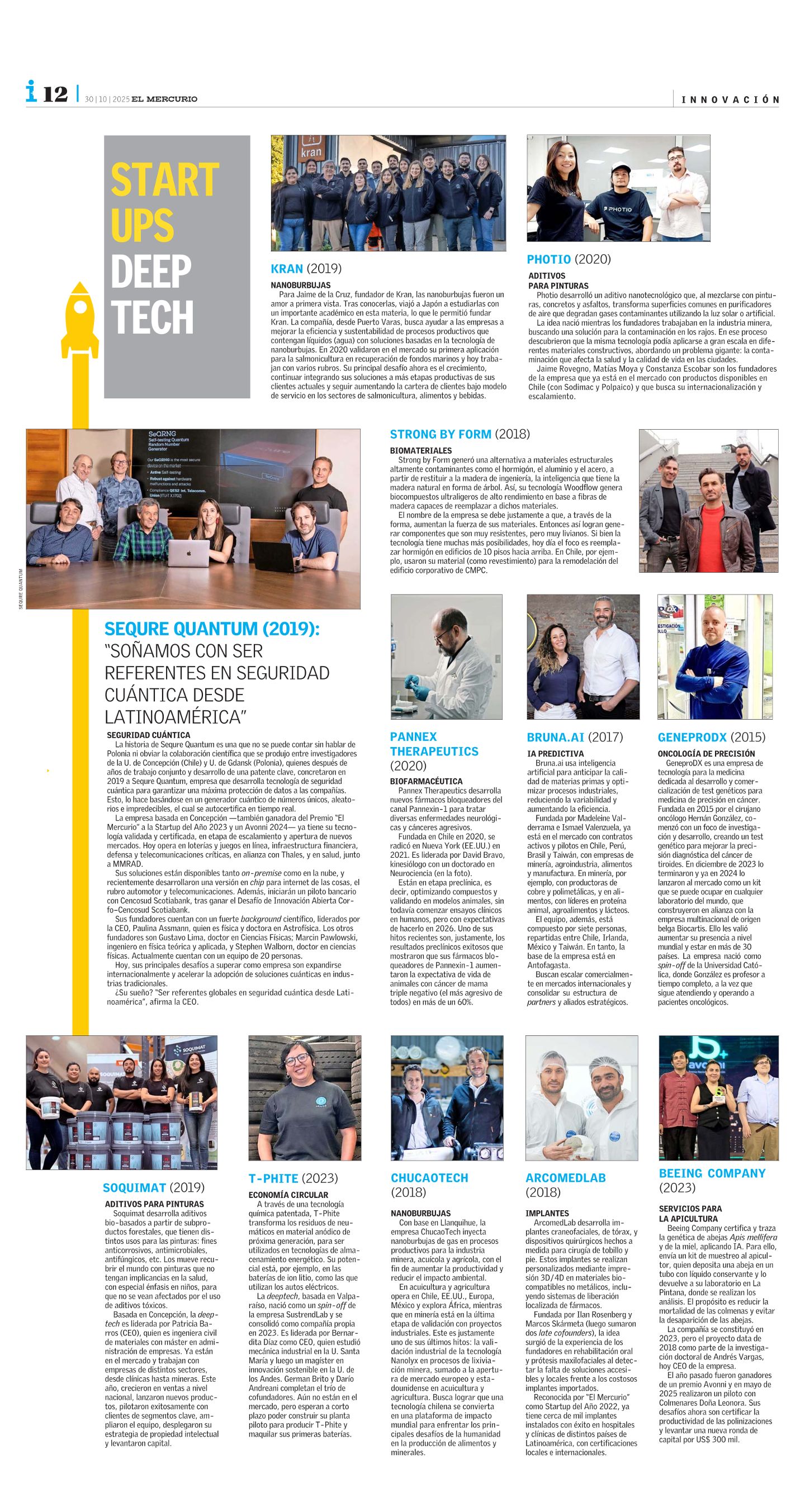 Sequre Quantum, fundada en 2019 tras una colaboración entre la UdeC y la Universidad de Gdansk, fue reconocida por El Mercurio como una de las startups chilenas más prometedoras de la década 2015-2025. La compañía desarrolla tecnología de seguridad cuántica basada en generación aleatoria de números. Con operaciones en sectores críticos y alianzas clave, busca expandirse globalmente y liderar desde Latinoamérica.