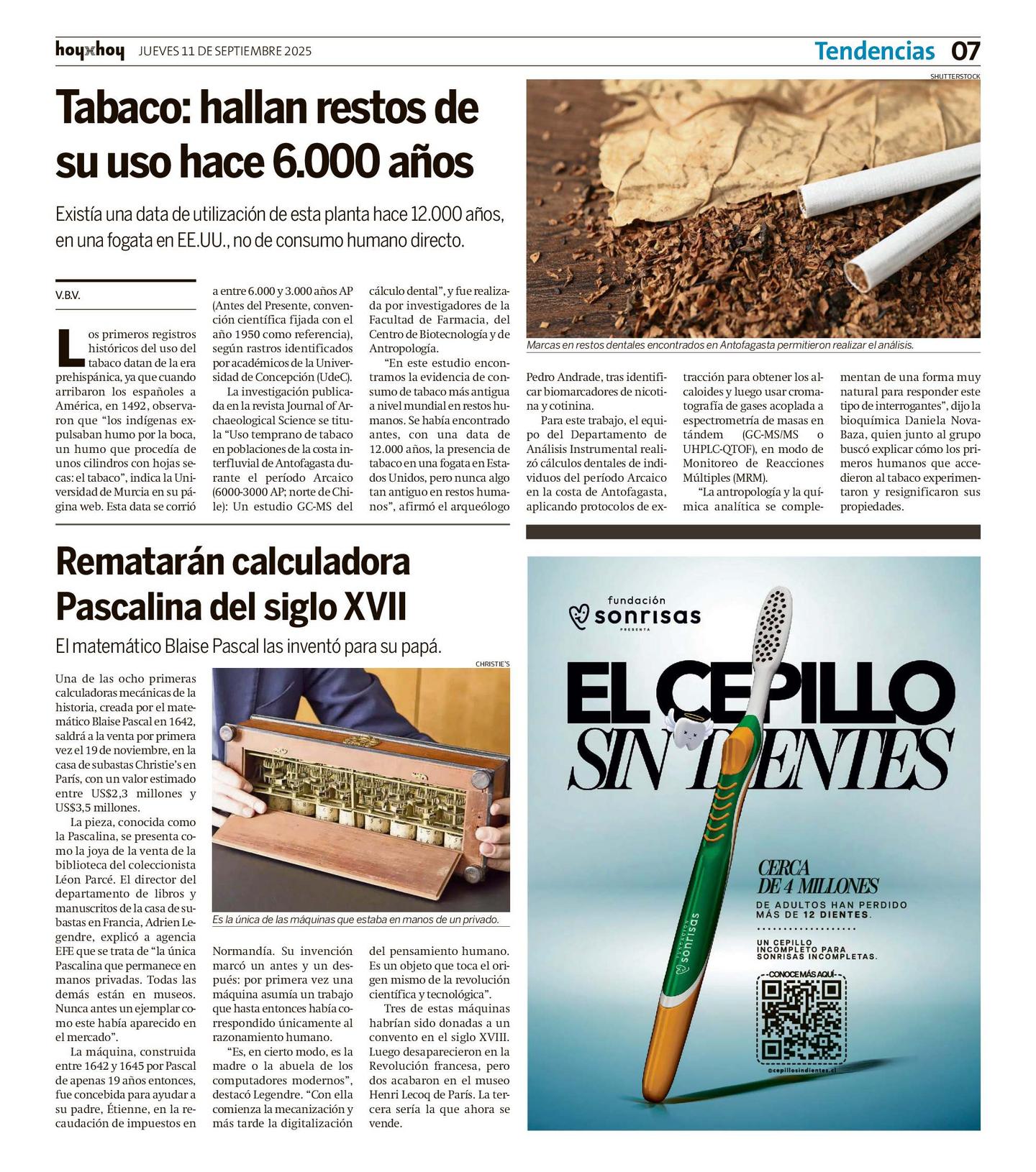 Investigadores UdeC hallaron evidencia del consumo humano de tabaco más antigua del mundo, entre 6.000 y 3.000 años AP, en restos dentales de pobladores del norte de Chile. El estudio aplicó técnicas avanzadas de análisis químico para detectar nicotina y cotinina en individuos del periodo Arcaico.