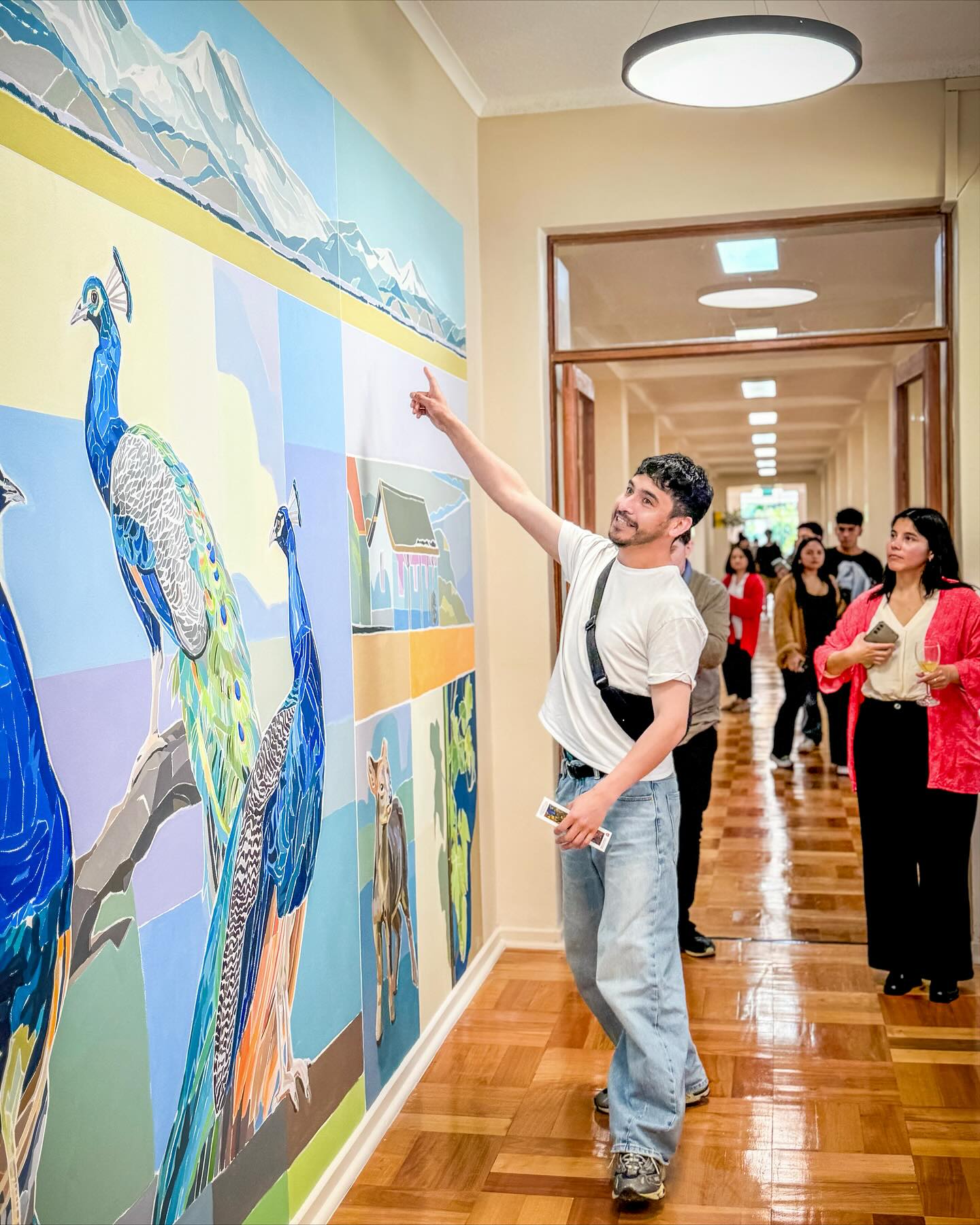 Otro elemento que destaca es el mural “Encuentro”, ubicado al ingreso y cuyo autor es el artista visual y muralista, Alumni UdeC, Piero Maturana, quien explicó que la obra busca reflejar la vinculación que tiene la Universidad con la región de Ñuble, mediante elementos rurales e icónicos del campus, como los pavos reales y los pudúes.