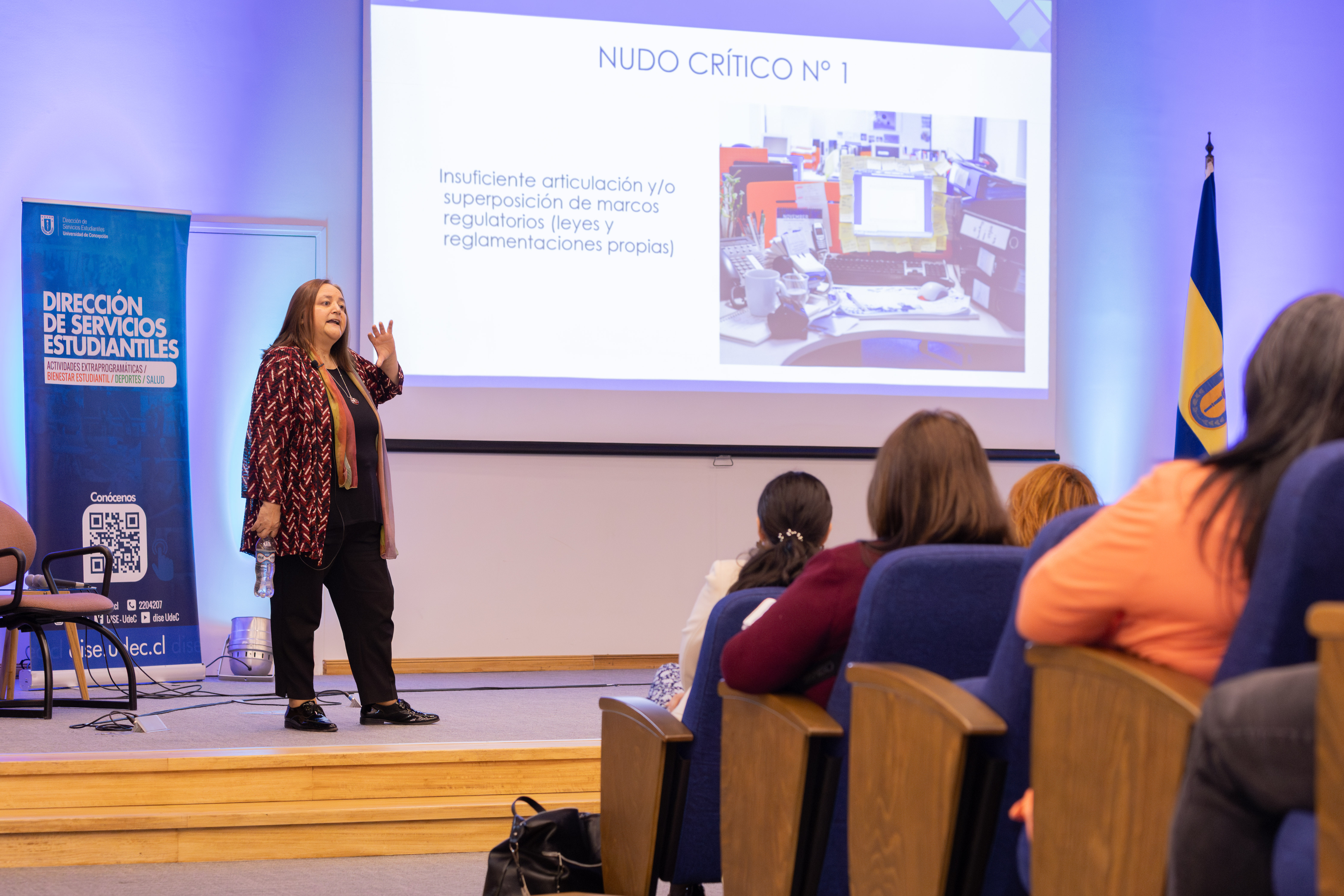 La exposición estuvo a cargo de la representante de la UdeC en la comisión, coordinadora de la zona sur y directora de Servicios Estudiantiles de la Universidad, Cecilia Pérez Díaz. La exposición destacó por la presentación crítica de los nudos identificados en el documento, particularmente los que tienen que ver con la baja en la participación estudiantil y la insuficiente adecuación de las trayectorias académicas a la diversidad.