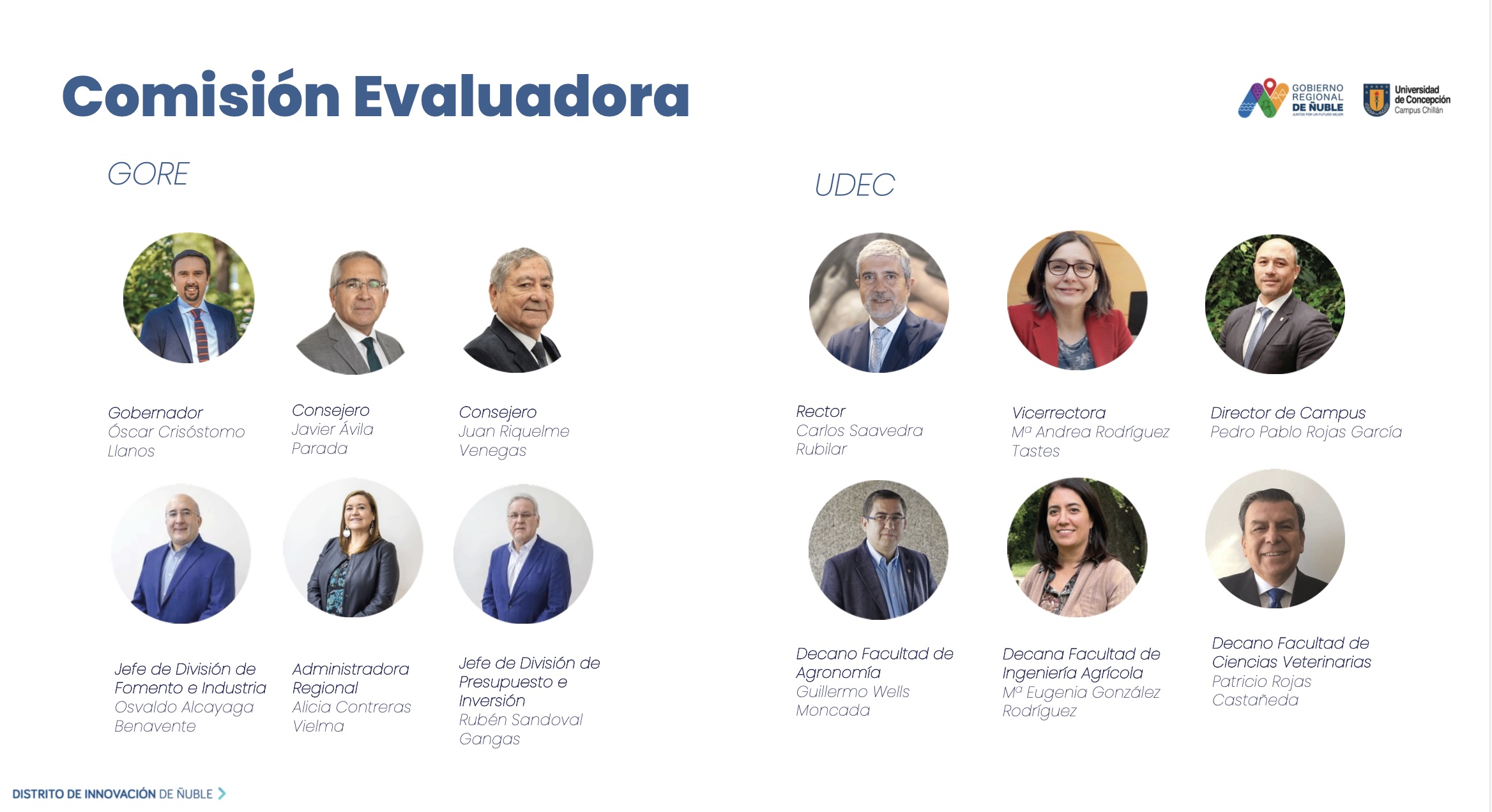 Estará integrado por representantes del Gore y la UdeC: Alicia Contreras Vielma, Administradora Regional; Rubén Sandoval Gangas, Jefe División de Presupuesto e Inversión Regional, y Óscar Díaz, Coordinador de Análisis y Evaluación de la División de Inversión y Presupuesto; Dr. Jorge Carpinelli Pavisich, Director de Desarrollo e Innovación UdeC; Dr. Daniel Sandoval Silva, Director del FIC-R del Distrito de Innovación de Ñuble y Subdirector del Campus UdeC Chillán, y Víctor Allendes, Coordinador del FIC-R del Distrito de Innovación de Ñuble. Este último fue ratificado como el Encargado Regional del Convenio, quien tendrá la función de convocar al Comité Técnico y emitir informes de seguimiento del estado de avance del Convenio.