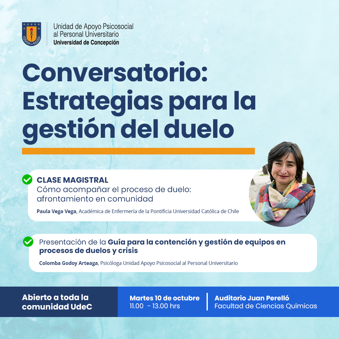 El documento que se presentará el martes recopila información de distintos autores, estudios y literatura que aborda el proceso de duelo en personas y equipos. La idea, explicaron desde la Unidad, es que sea una guía para acompañar a los equipos y al personal de la Universidad de Concepción en el proceso de reparación ante la pérdida de alguna persona de la comunidad universitaria -sea esta una funcionaria, funcionario o estudiante- a través de estrategias para la contención emocional y psicoeducación.