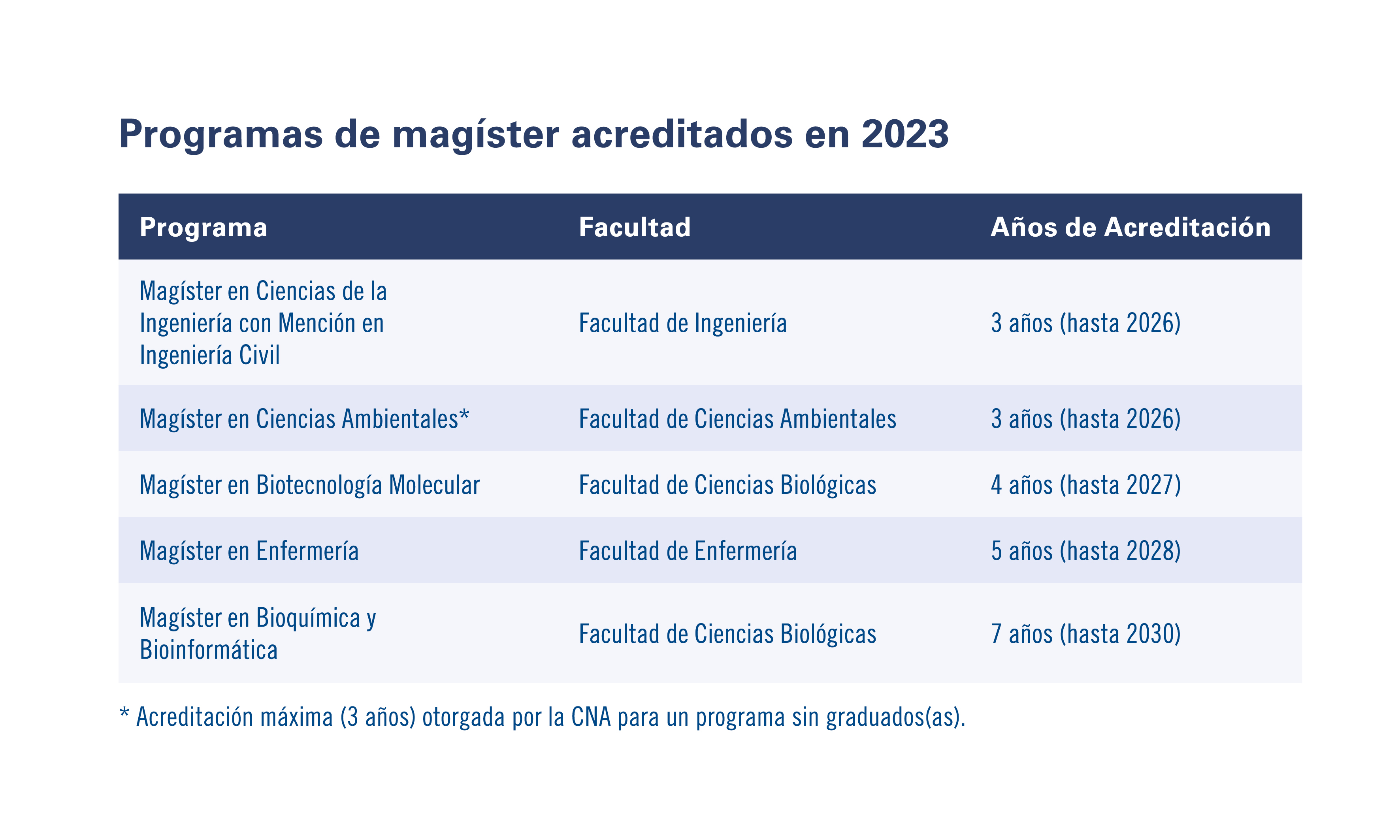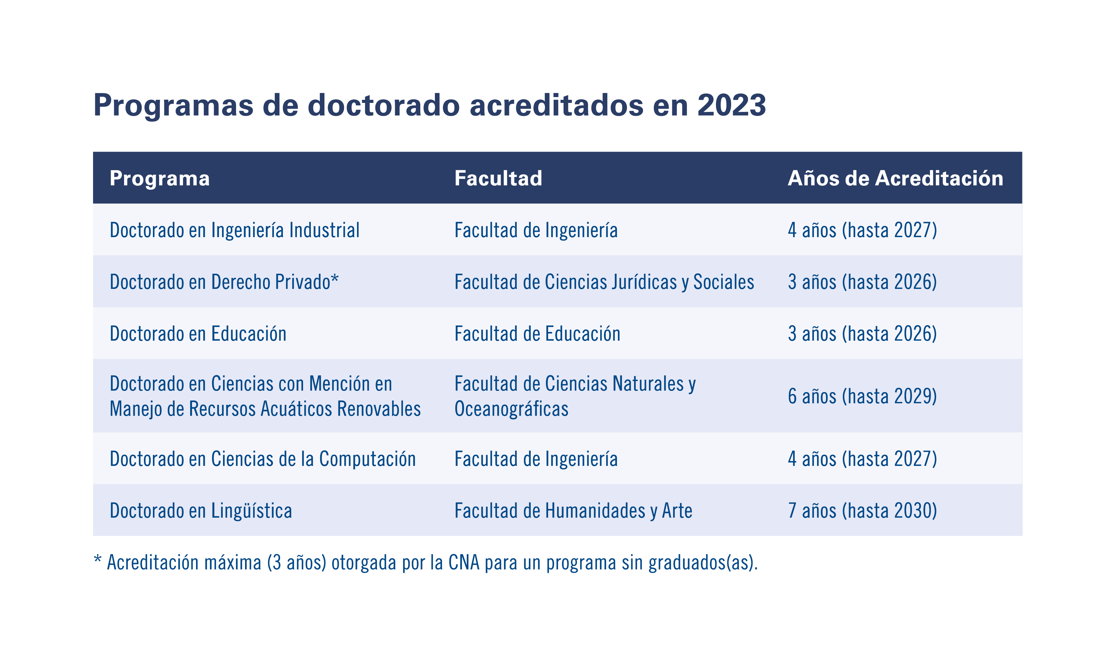 Una importante oferta de programas acreditados es la que presenta la Universidad de Concepción en materia de postgrados. De los programas de magíster disponibles actualmente, 35 ya cuentan con la acreditación. En tanto, en el caso de los doctorados, el total de los programas antiguos se encuentran acreditados, mientras que de los tres doctorados nuevos, iniciados en marzo pasado, uno ha alcanzado la acreditación máxima (3 años) otorgada por la CNA para un programa sin graduados(as). Otros dos programas de doctorado se encuentran a la espera de la resolución por parte de la CNA.