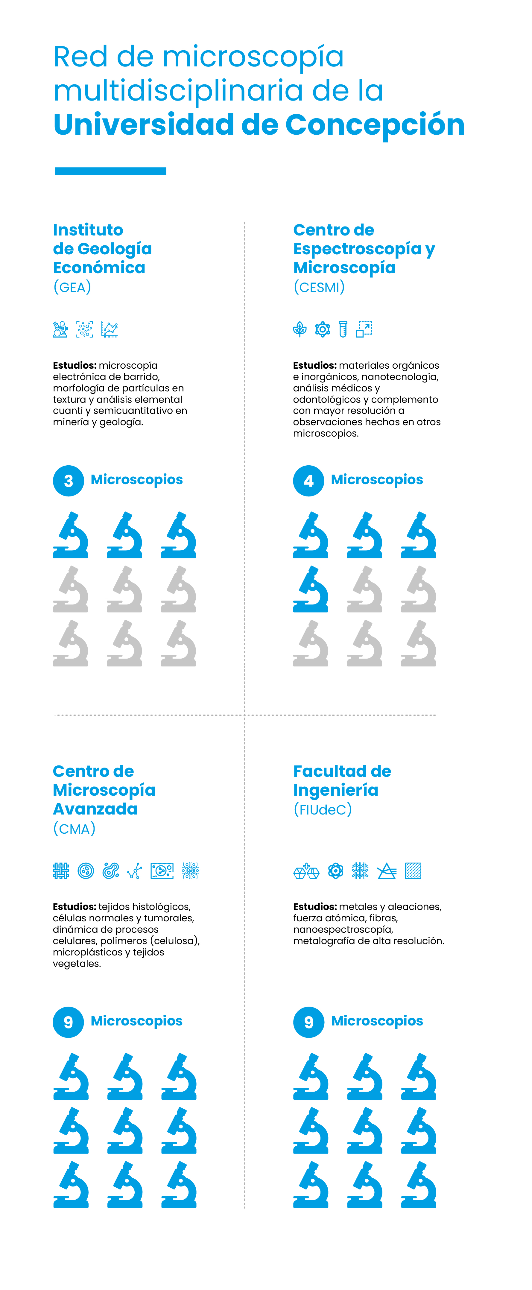 Desde septiembre de este año, se encuentra funcionando en la Universidad de Concepción la red de microscopios más diversa de Latinoamérica, con 25 equipos multidisciplinarios que se concentran en pleno corazón del campus central de la casa de estudios -en un radio de menos de 1 km de distancia-. Esto la convierte en la única universidad del país que agrupa esta capacidad de análisis en un solo lugar.