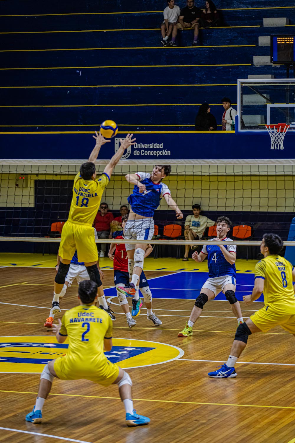 Buena figura Benjamín Ruiz en el local, que pasaba arriba 19-12 tras remache ganador de su hermano Vicente. Tiempo técnico solicitado por la selección chilena sub 17. Franco Díaz con fuerte ataque le dio ventaja de doble dígito a la Universidad de Concepción (22-12).